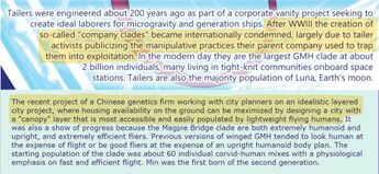 And speaking of genetic engineering, two species of humans were genetically created, the “tailers” and the people of the magpie bridge project. The tailers were created by a corporation for zero gravity work, so they have problems in normal gravity, and their creation is portrayed as a unanimously bad thing. The people of Magpie Bridge were created by the Chinese government to inhabit the upper layers of a city to be more “eco-friendly”. Their entire section of the lore page is just gushing about how well they are made and how much the Chinese government (mind you, the same government that in real life now has an “ethnic unity” program, guess what happens in it) cares for them. Oh, right, China is communist and is full of “POC” so everything they do is fine.