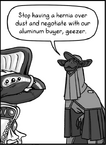 I also see a big problem with the "antagonists" of the comic. They just seem like normal people. Protag's boss doesn't really do anything except for being a normal corporate boss, and there's this Bird-alien coworker who in the new pages tries to help Protag and Muslim, but after it's clear he can't help them he goes off to do other things. Apparently that makes him and the boss horrible people. What???